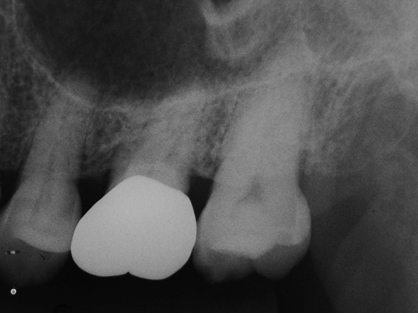 患歯(矢印)にヒビが入っているかレントゲン診査では分かりませんが、大きな病巣?は確認できません。